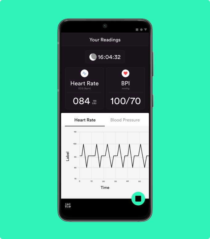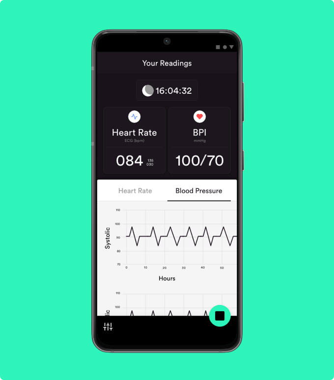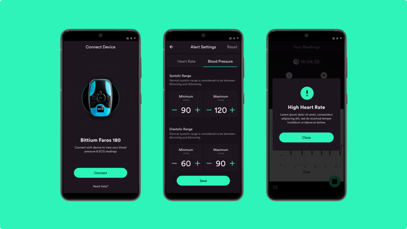 By interfacing with the Bittium Faros device via Bluetooth, the app provides real-time heart rate (HR) and blood pressure (BP) readings. This mobile platform enhances user engagement through instant data display and prepares the foundation for future features.